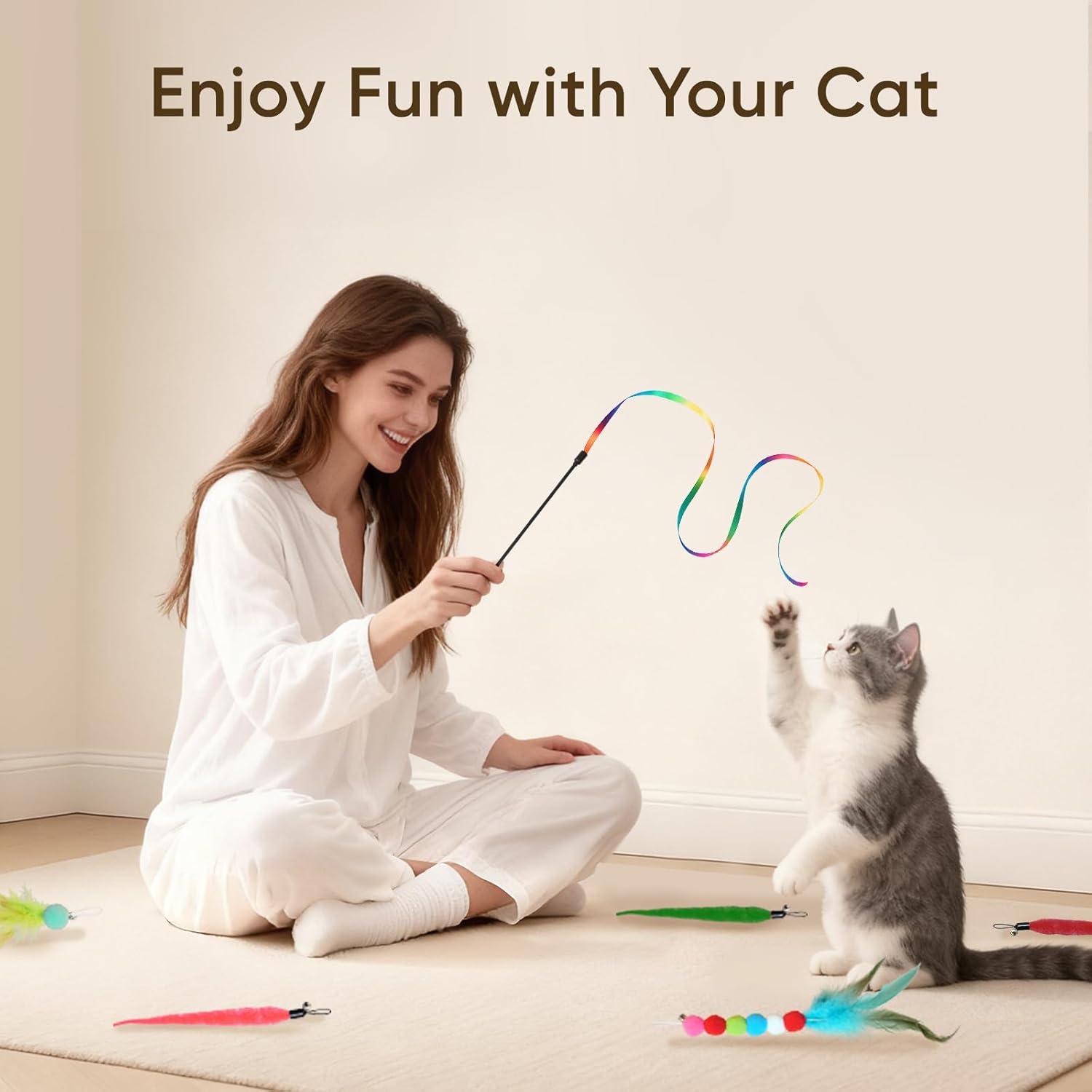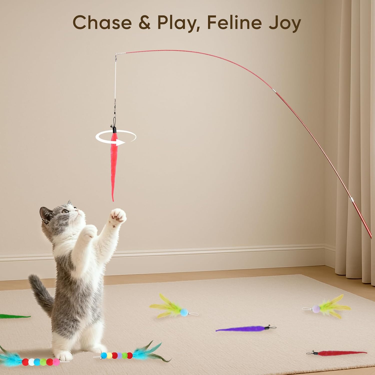 - Premium Materials for Safety and Durability: Crafted from non-toxic, pet-safe materials, each toy withstands spirited play. The reinforced wand handle offers a comfortable grip for extended interactive sessions, while the securely attached feathers and bells withstand even the most enthusiastic feline antics. You gain peace of mind knowing your cat’s playthings are both safe and lasting.